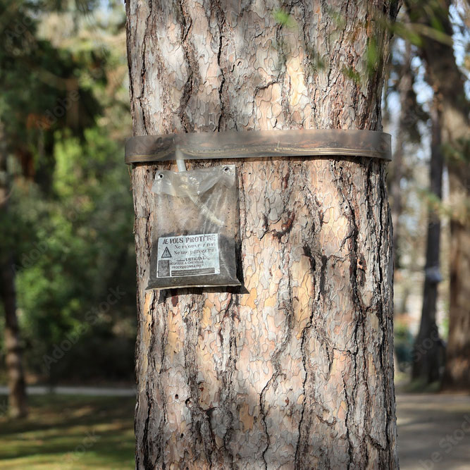 4. Barrières anti processionnaires : Les colliers pièges installés autour des troncs d'arbres capturent les chenilles lors de leur descente en procession, empêchant leur dispersion dans l’environnement et réduisant ainsi les risques pour la santé humaine et animale.