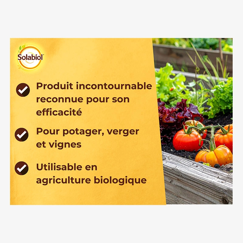 Fongicide naturel à base de sulfate de cuivre et de chaux , protège et traite les plantes contre les maladies comme le mildiou et la cloque du pêcher.
