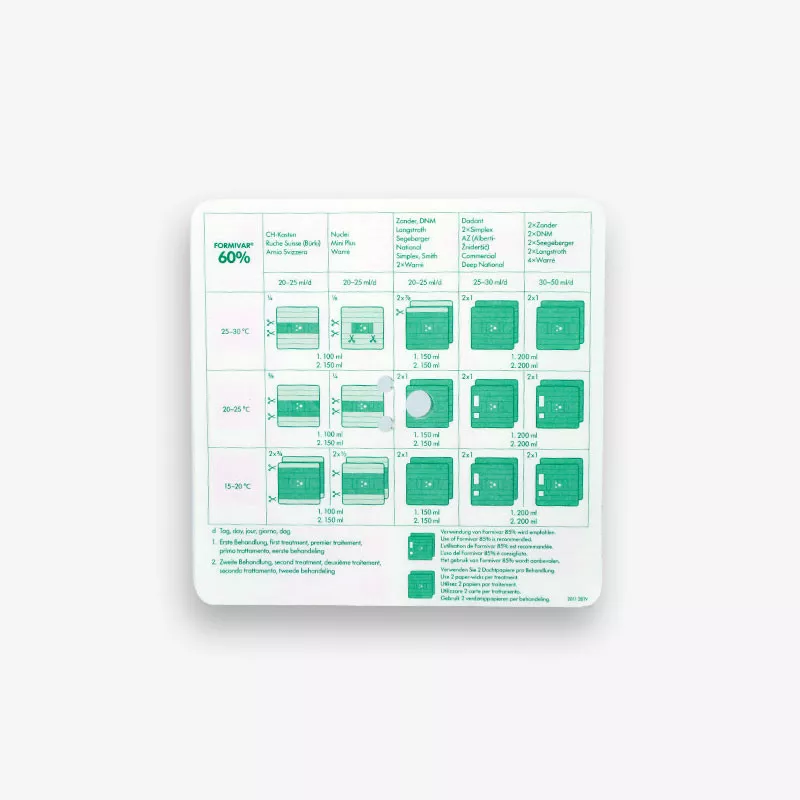La surface du papier buvard régule l’évaporation du produit. Entièrement imbibé l'acide formique s'évapore dans le volume et l'air de la ruche.
