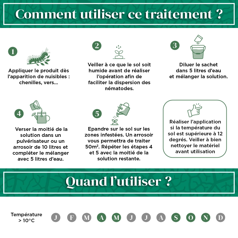 - Doit s’appliquer en période humide pur assurer l’infiltration des nématodes dans le sol