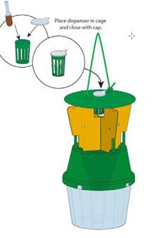Une fois le piège complet installé, il diffuse une phéromone attirant les ravageurs vers l’intérieur où ils se retrouvent piégés.