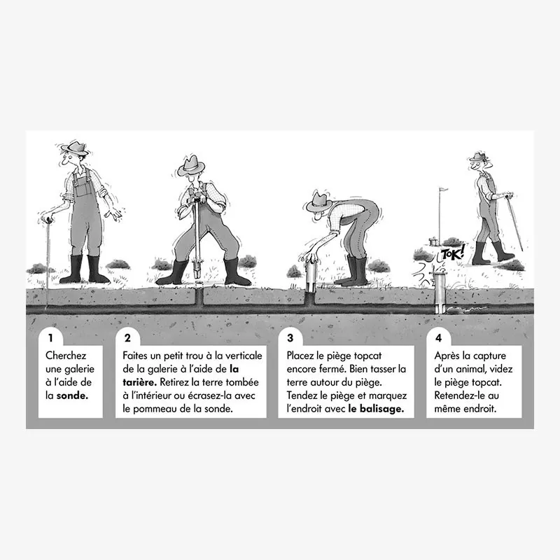 Nous conseillons au préalable de repérer la galerie principale avec la sonde Topcat pour optimiser ensuite l'emplacement du piège Topcat.