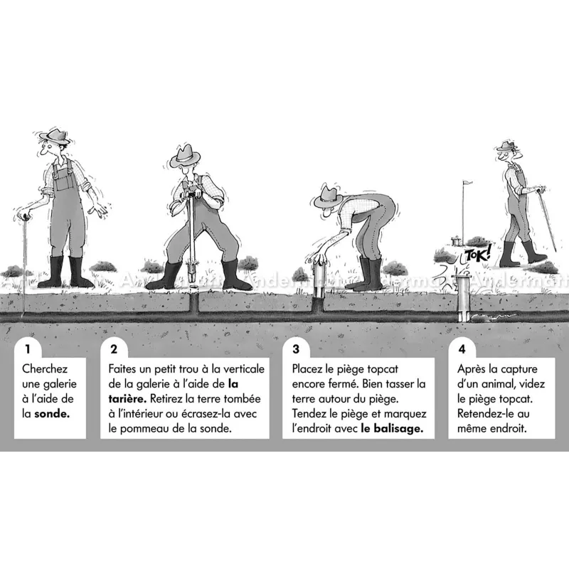 La sonde permet de repérer facilement les galeries et la tarière creuse un trou parfaitement adapté à votre piège à taupes TOPCAT.